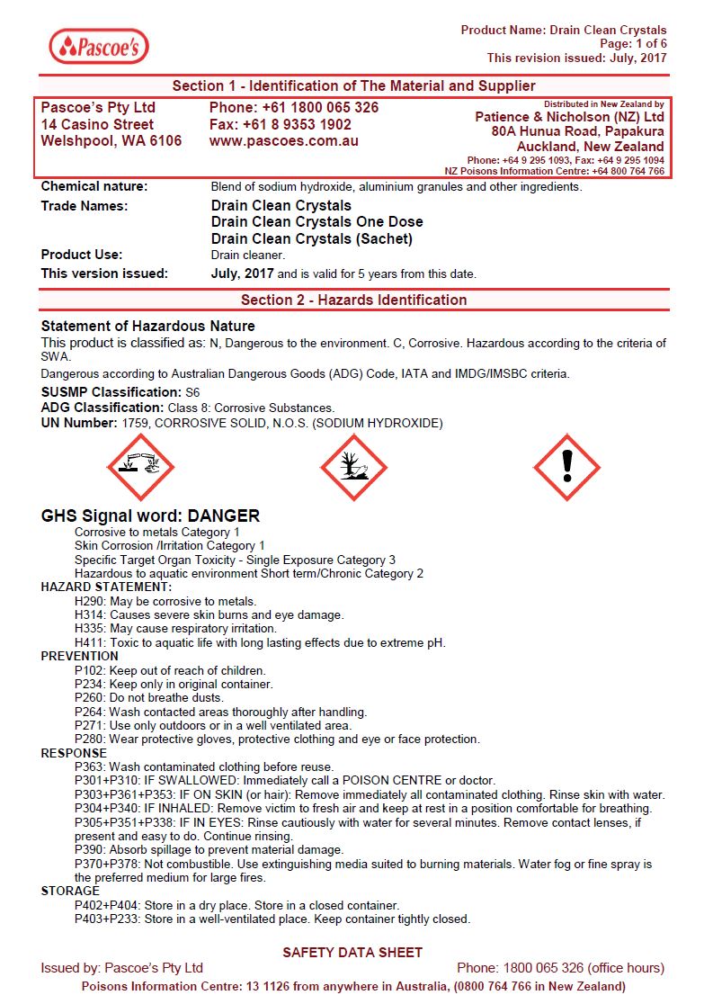 MSDS Drain Clean Crystals