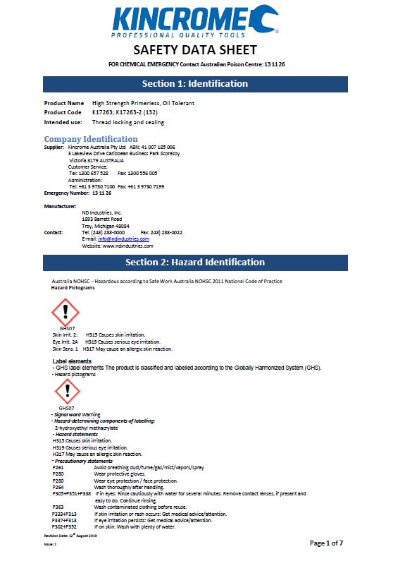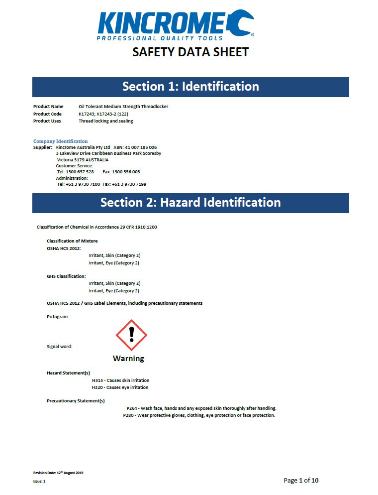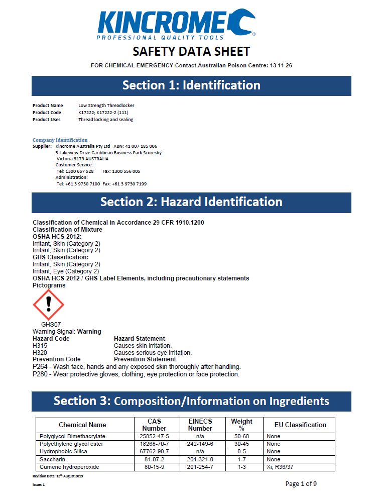 MSDS Kincrome Thread Locker High Strength