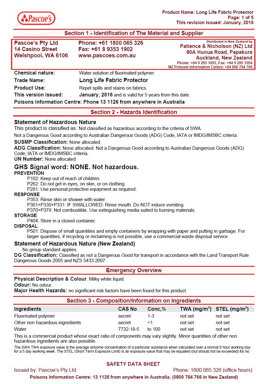 MSDS Long Life Fabric Protector