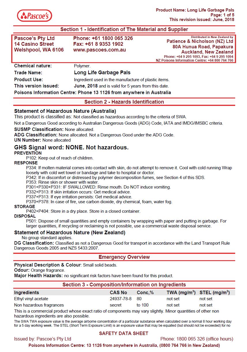 MSDS Long Life Garbage Pals
