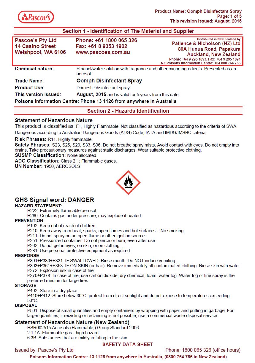 MSDS Oomph Disinfectant Spray