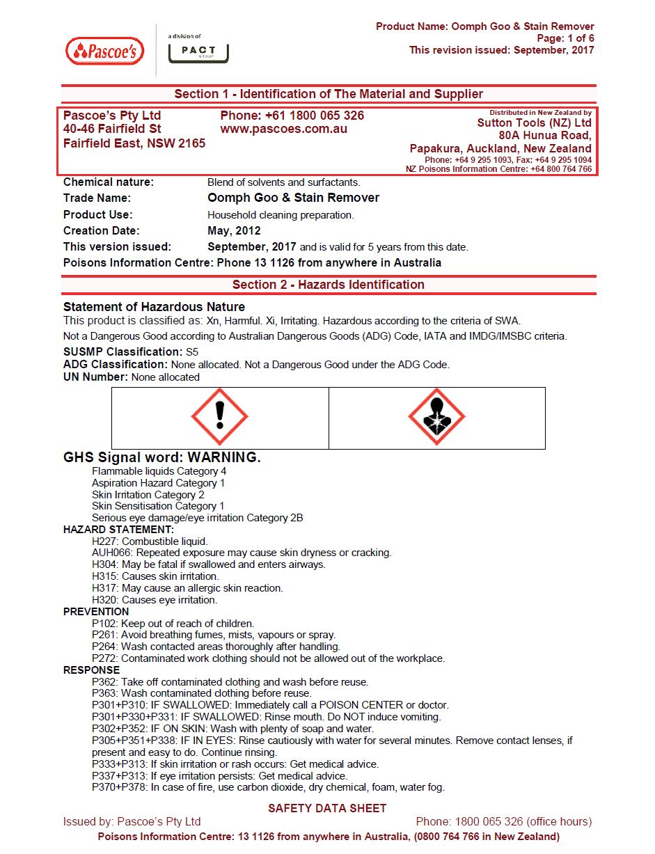 MSDS Oomph Goo & Stain Remover
