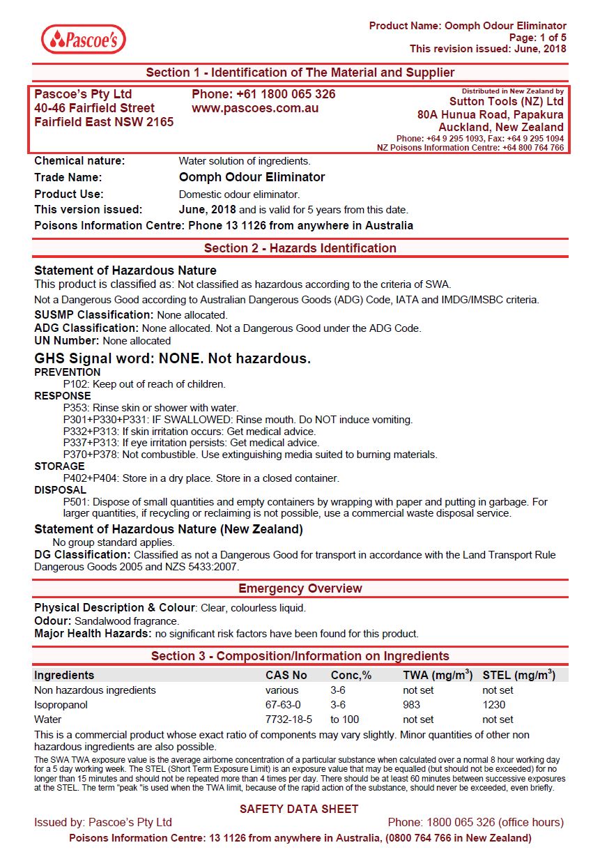 MSDS Oomph Odour Eliminator