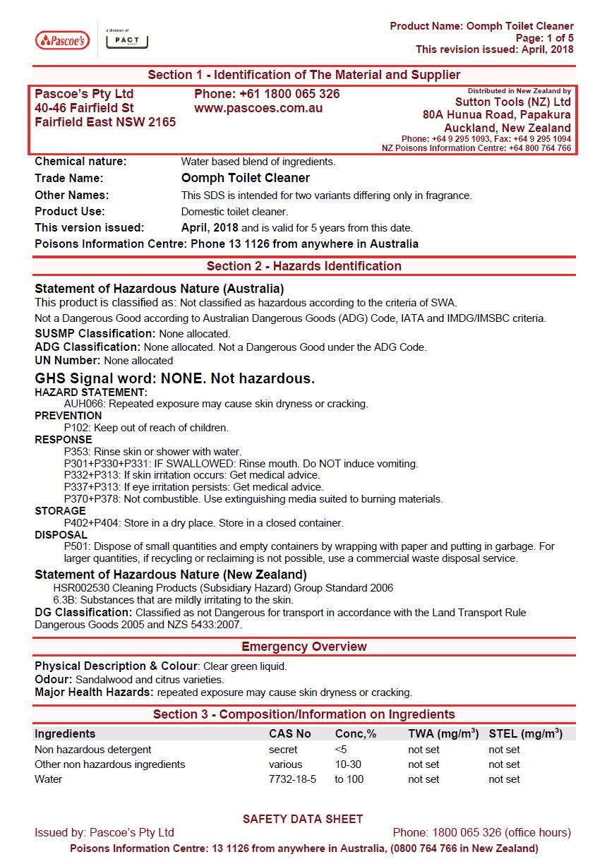 MSDS Oomph Toilet Cleaner
