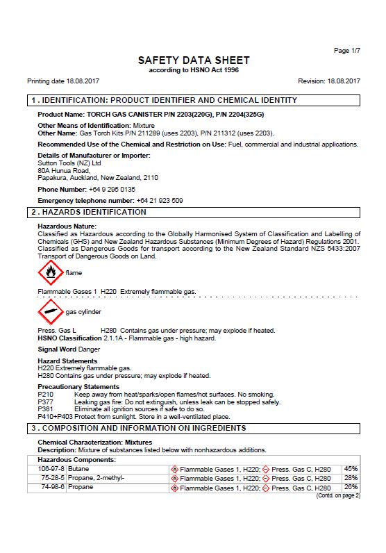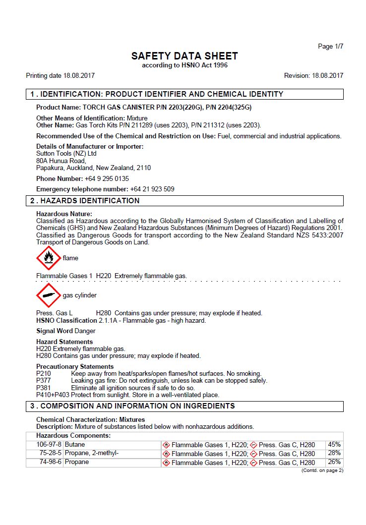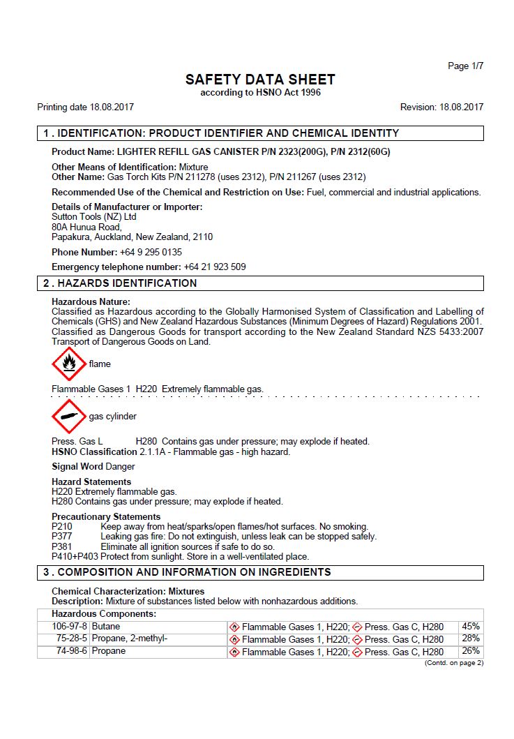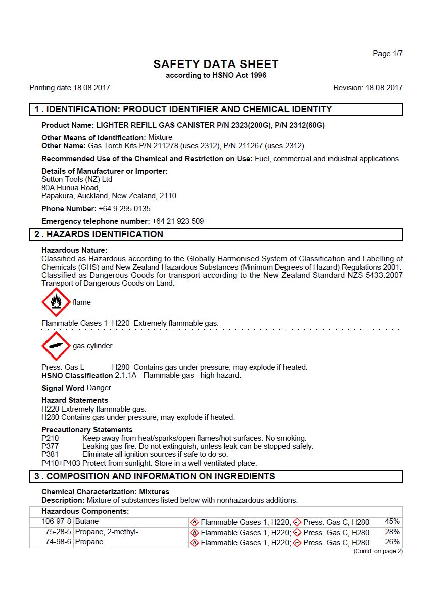 MSDS TradeFlame JP2323 Push On Butane Catridge 200g